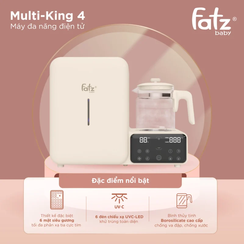 Dòng máy Multi-king được yêu thích bởi sự đa năng giúp mẹ tiết kiệm không gian và chi phí. Máy đa năng điện tử Multi-king 4 với thiết kế thông minh, kiểu dáng sang trọng được tích hợp tới 8 chế độ hoạt động. Bên trái là máy tiệt trùng UVC-LEDs, sấy khô và bảo quản. Bên phải là bình đun và hâm nước pha sữa điện tử. Multi-king 4 sở hữu nhiều tính năng ưu việt nhưng lại có mức giá vô cùng cạnh tranh so với các dòng máy khác trên thị trường.