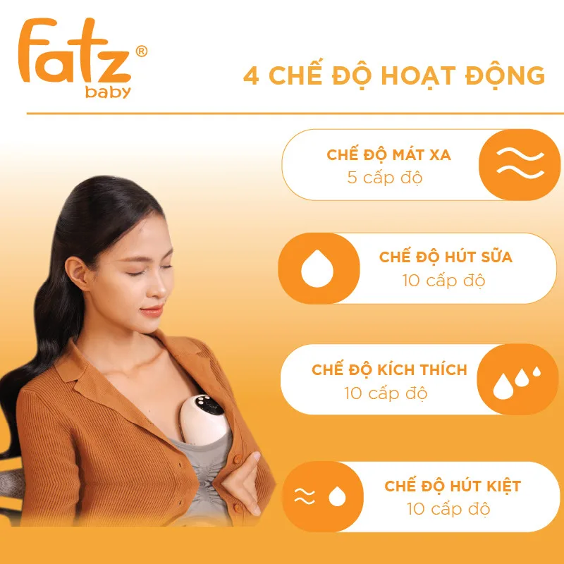 - Bơm mạnh và êm với 4 chế độ hút: Chế độ massage (5 cấp độ)/ Chế độ hút sữa (10 cấp độ)/ Chế độ kích thích (10 cấp độ)/ Chế độ hút kiệt (10 cấp độ).