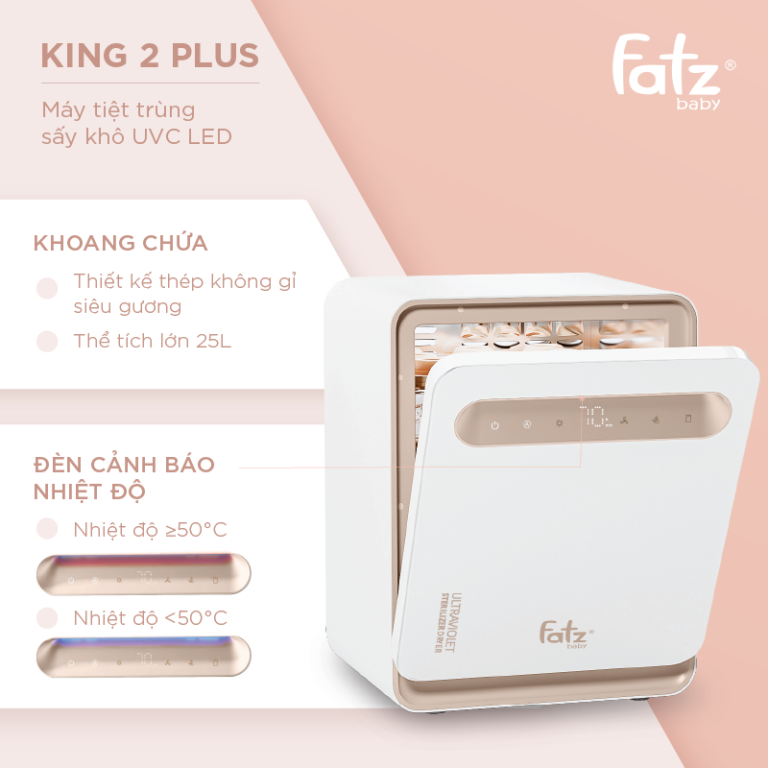 King 2 plus là máy tiệt trùng sấy khô UV có dung tích 25 L lớn nhất trên thị trường hiện nay với hệ đèn LED 2 lớp (8 bóng từ trần chiếu xuống và 8 bóng từ đáy máy hất lên), tổng công suất lên tới 10W. Điểm vượt trội của máy so với các thế hệ UV đi trước là bộ cảm biến nhiệt bảo vệ máy luôn giữ dưới 65 độ C, tránh làm nóng quá mức khi sấy khô, điều này giúp không những giúp cho các vật dụng không bị lão hoá nhanh mà còn làm tăng độ bền cho đèn UV LED. Ngoài ra, bên cạnh 2 kệ đặt bình sữa thông thường, máy còn trang bị thêm giỏ inox lớn, thuận tiện cho việc tiệt trùng quần áo hay đựng các vật dụng nhỏ cho bé, có thể nói mẹ có thể tiệt trùng cả thế giới chỉ với King 2 Plus.